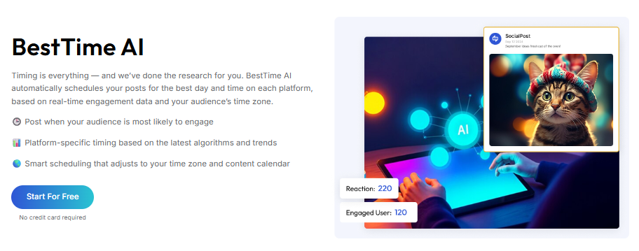 Timing can make or break a social post. BestTime AI schedules your content for the best day and time on each platform, using real-time engagement data and your audience’s time zone.